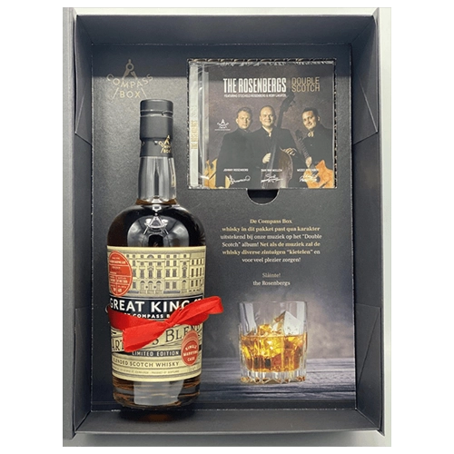 U vindt in deze set een Compass Box Artist’s Blend Ex-Sherry Single Marrying Cask & het album Double Scotch van The Rosenbergs in een mooie verpakking.