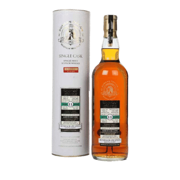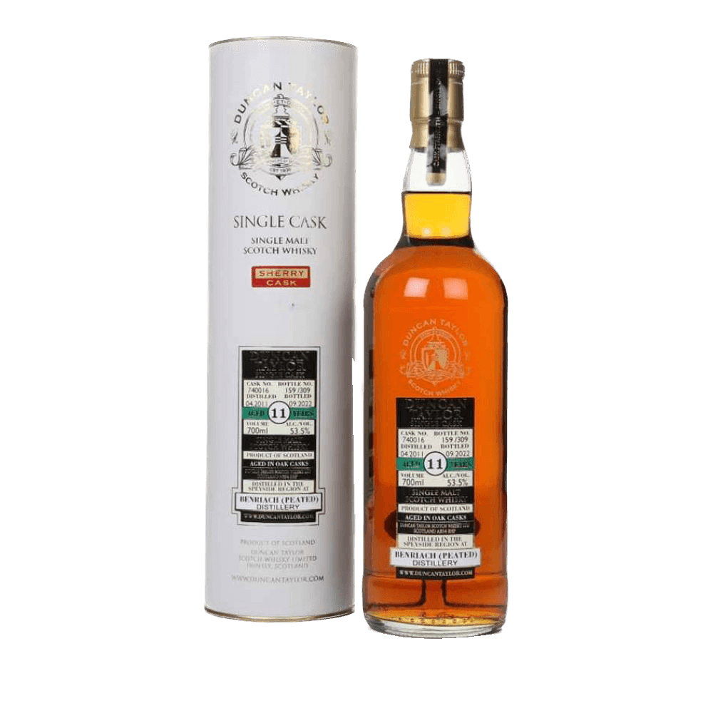 Deze single malt, een geturfde botteling van de Benriach-distilleerderij, heeft 11 jaar gerijpt tussen 2011 en 2022. In die tijd lag hij ook een periode op een sherryvat, dus je kunt hier een glorieuze mengeling van gestoofd fruit en scherpe rook verwachten. Een totaal van 309 flessen is uitgebracht in het assortiment van onafhankelijke releases van Duncan Taylor.