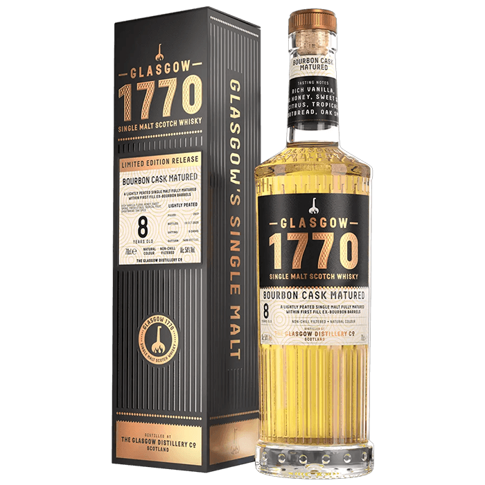 Een nieuwe toevoeging aan het Glasgow 1770 Single Malt-assortiment: Bourbon Cask Matured. Een doorlopende botteling die gelijke delen van twee whiskyproductiestijlen die de Glasgow Distillery hanteert combineert: ongeturfde en geturfde single malt.