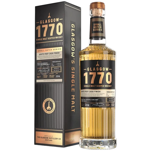 De Glasgow Distillery 1770 Triple Distilled White Port heeft in totaal zes jaar gerijpt: de eerste 4 jaar en 7 maanden in first-fill ex-bourbonvaten, waarna hij nog eens 1 jaar en 7 maanden is afgerond in hogsheads van Frans eikenhout die eerder voor witte port zijn gebruikt.