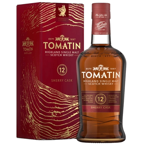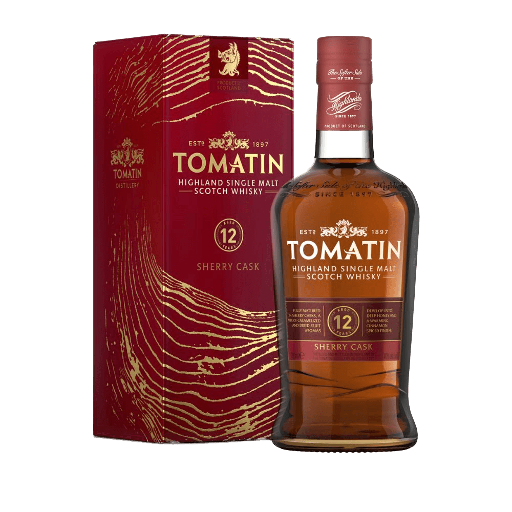 De Tomatin 12 YO Sherry Cask release bouwt voort op de klassieke en soepele Tomatin 12 Year Old, waarbij de smaak wordt aangescherpt door middel van een pure sherry vatrijping. Het resultaat is een opmerkelijke dram die het uitzonderlijke vakmanschap, de traditie en de kwaliteit belichaamt van de Highland-malt. De decadente, rijke smaken die de sherryvaten hebben afgegeven komen prachtig tot uiting in deze whisky.