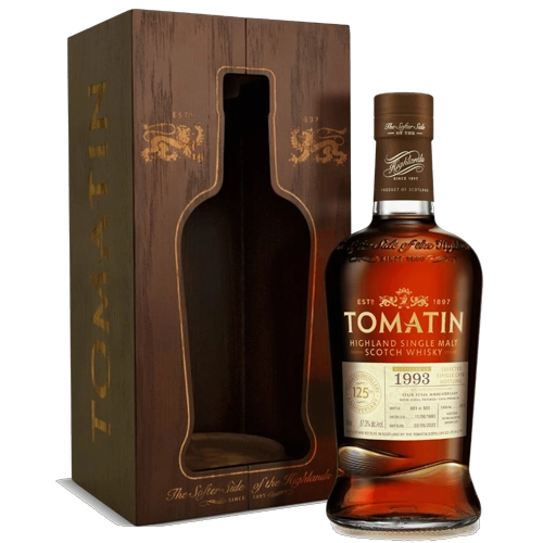 Vergelijkbaar met het type vat dat zou zijn gebruikt in 1897, het jaar waarin de Tomatin distilleerderij werd geopend, is de Tomatin 1993 125th Anniversary een geweldig voorbeeld van een whisky die tijd nodig heeft om te openen. Diep en rijk, de neus is aanvankelijk heel zacht en in de mond bruist hij van de smaak van het Oloroso Sherryvat waarin hij heeft gerijpt. De aroma’s van koffielikeur, flamed sinaasappel, karamel en zwarte walnoot worden steeds onthullen een krachtigere en donkere kant, daarna ontwikkelen zich kruidige tonen van pijptabak en eucalyptus. Enorme sherrytonen omhullen het gehele smaakprofiel. Dit wordt gevolgd door een golf van Europese eikenkruiden, toffee en pure chocolade. Na verloop van tijd ontwikkelt zich een zoethoutsmaak samen met een vleugje Assam-thee. De afdronk is diep en rijk. Een korte droogheid van de Assam Tea-noot wordt vervangen door opnieuw opkomende rozijnen en chocolade.