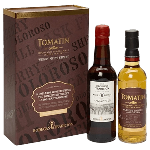 Tomatin Oloroso Sherry gift pack bevat een fles Tomatin Oloroso Finish 14 years ( 0,35 L) en een fles Bodegas Tradicion Oloroso Sherry 30 years ( 0,375 L ). De Bodegas Tradicion Sherry 30 years heeft intense fruitige aroma’s met rozijnen, vijgen en pruimen en tonen van gedroogde tomaten, stro, drop en zoethout. Deze sherry heeft een zijdezachte, compacte, filmende smaak.